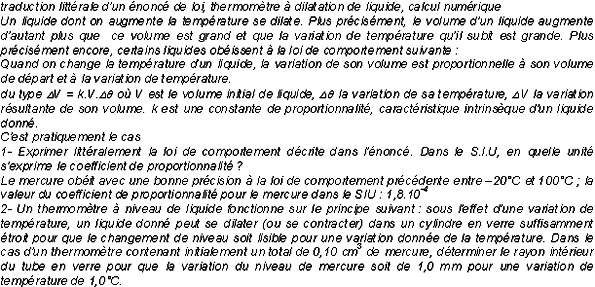 Traduction littérale d'un énoncé de loi, thermomètre à dilatation de liquide, calcul numérique