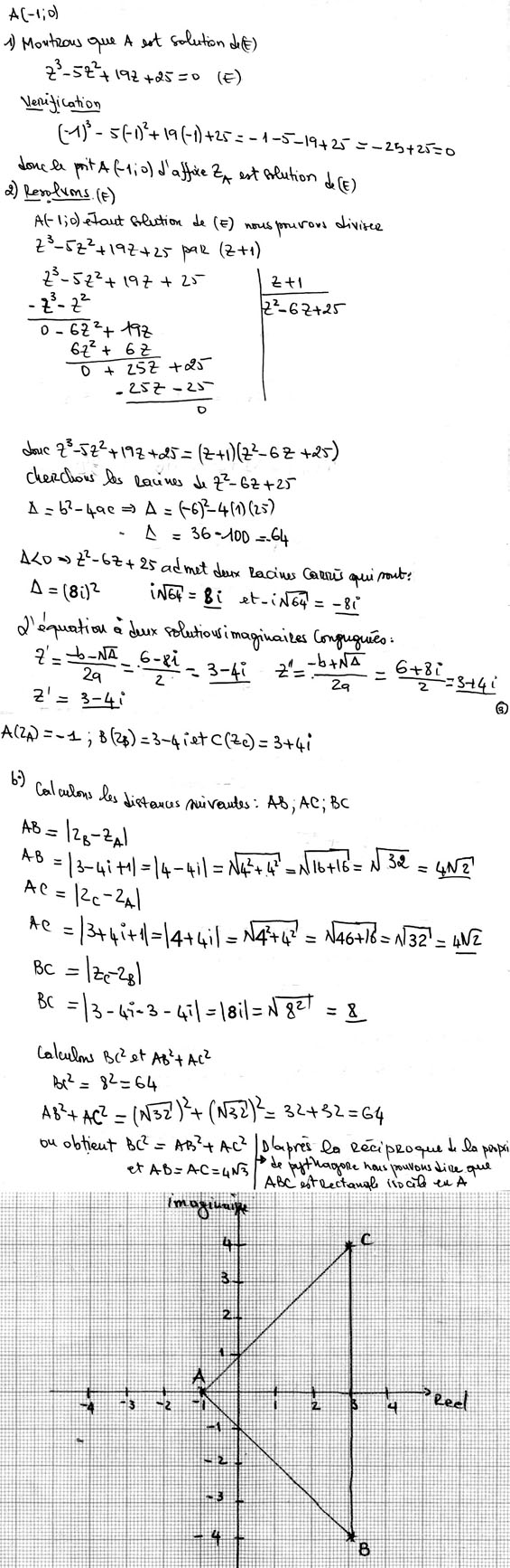 Dans le plan complexe, résoudre une équation de nombre complexe, placer des points et démontrer qu'un triangle est isocèle et rectangle.
