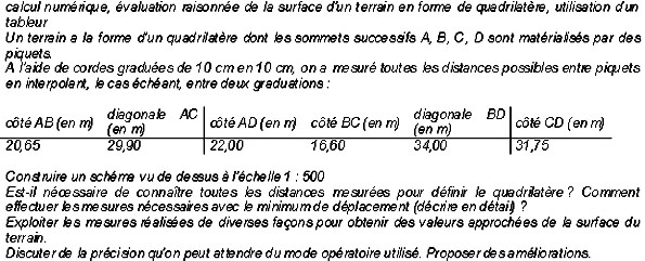 Calcul numérique, évaluation raisonnée de la surface d'un terrain en forme de quadrilatère, utilisation d'un tableur