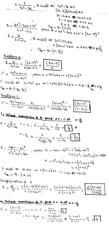 Trouvez la condition d'existance d'une valeur numérique pour chaque fraction rationnelle. Ensuite, simplifiez - les. Calculez par la suite les valeurs numériques pour certaines valeurs de l'inconnue X.