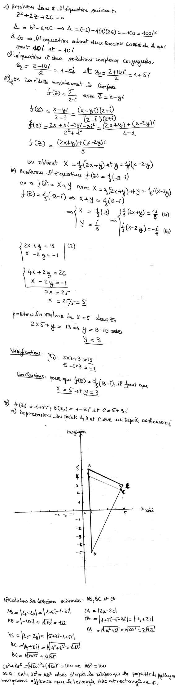 Résoudre des équations de nombre nomplexe, déterminer les parties imaginaire et réelle d'un nombre complexe et démontrez qu'un triangle est rectangle.