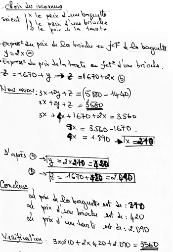 Déterminez à l'aide d'un système d'équations le prix des baguettes, des brioches et de la tarte achetées par Maimouna