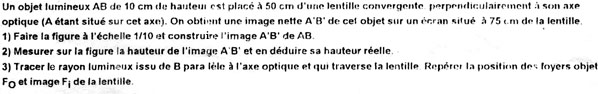 Faire la figure réprésentant un objet et son image par une lentille à l'échelle 1/10. En déduire les hauteurs de cet objet et de son image. Tracez ensuite des rayons lumineux.