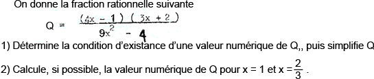 Q est une fraction rationnelle. Trouvez sa condition d'existance puis simplifiez la. Une fois que vous avez terminé, déduisez la valeur numérique de Q pour X =1 et X = - 2 / 3.