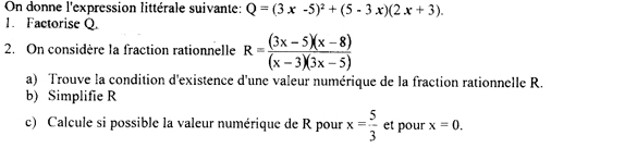 On donne une expression littérale, dénominateur d'une fraction, à factoriser. Puis, trouver la condition d'existance de la fraction. Simplifier cette fraction et calculer la valeur numérique pour X = 5 / 3.