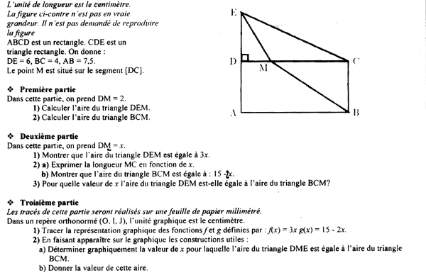 Calculez l'aire de plusieurs triangles dont les côtés forment un rectangle et représentez les fonctions de pour permettre de déduire les valeurs d'une inconnue pour laquelle deux aires de triangle sont égales